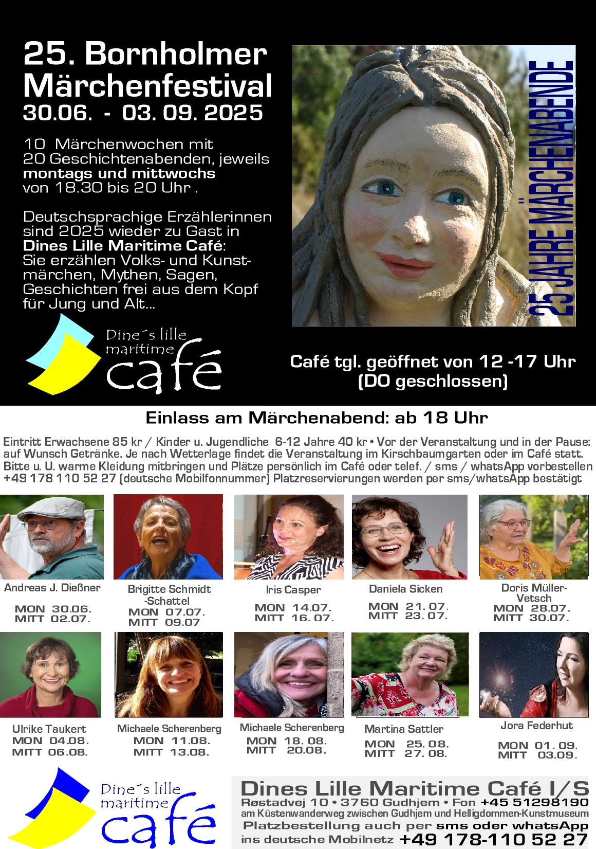 Professionelle Erzähler*innen aus Deutschland und Europa gastieren in Dines Lille Maritime Café, das der Ferienstätte Alte Strandvogtei angegliedert ist. Sie erzählen Geschichten, Volks- und Kunstmärchen aus aller Welt für Erwachsene und Kinder ab 6 Jahren. Erzählt wird in deutscher Sprache, frei aus dem Kopf. Die Märchenabende finden statt von Anfang Ende Juni bis Anfang September ( 20 Erzählabende jeweils MO/MI ab 18.30 Uhr), Dauer einer jeden Veranstaltung etwa 90 Minuten inkl. kleiner Pause. Auf Wunsch werden kalte und warme Getränke gereicht.